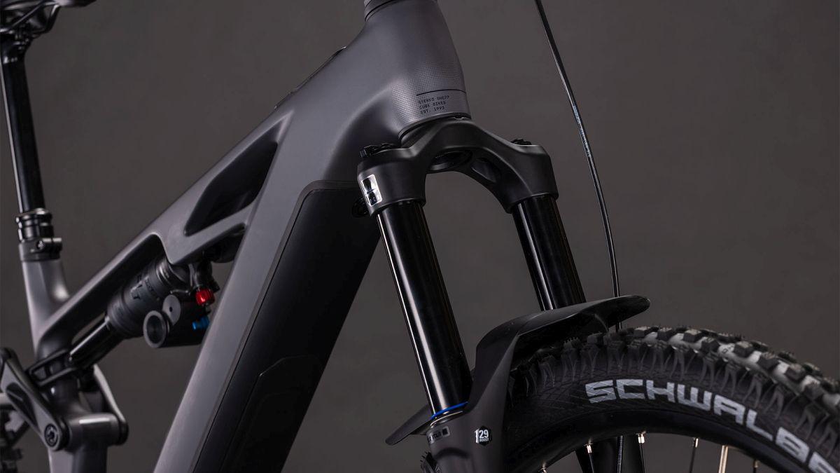Der Rahmen des Stereo Hybrid ONE77 HPC ist wahrlich eine Klasse für sich, denn hier treffen 170 mm Federweg an der Front und am Heck auf ein Mullet-Set-up mit einem 29 Zoll Vorderrad und 27.5 Zoll Hinterrad. Damit werden Big-Mountain-Trail-Träume wahr! Wie immer bei CUBE maximal detailverliebt konstruiert auch der Rest: Integrated Cable Routing sorgt für einen supercleanen Look. Dazu kommt ein Steuersatz zur Winkelverstellung, mit dem sich das Handling an individuelle Vorlieben und Anforderungen anpassen lässt. Außerdem haben wir den 800 Wh starken PowerTube Akku gleich über dem Bosch CX Motor sauber und formschön ins Carbon-Unterrohr integriert. Für einfachere Ersatzteilverfügbarkeit gibt's ein UDH am Aluminium-Hinterbau – und weil wir auch eine Direct Mount Kettenführung verbaut haben, geht's mit diesem Fully selbst bei schwierigen Bedingungen weiter, weiter und immer weiter.