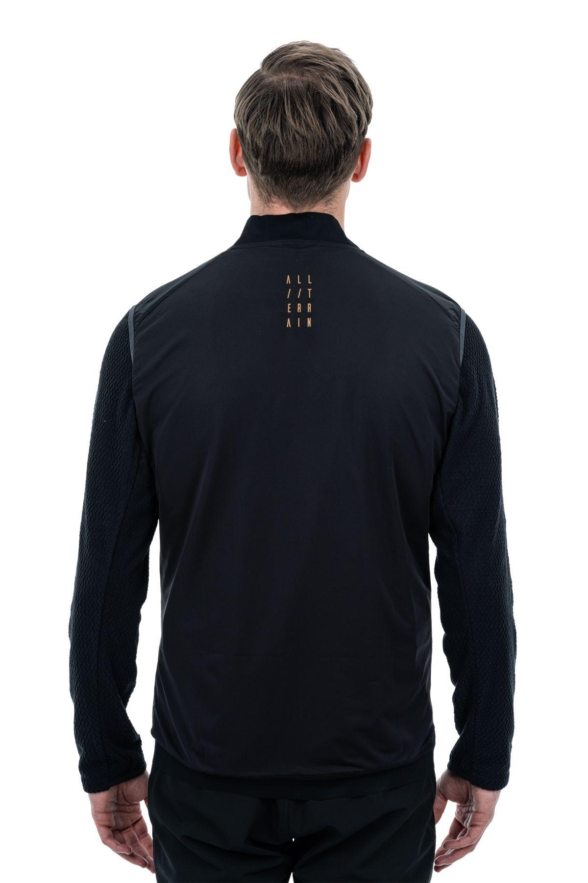 wasser- und windabweisendes Funktionsmaterial, enganliegender Kragen, reflektierende Elemente, elastischer Saum, Rückteil aus Mesh Material, Model ist 186 cm groß, Model trägt Größe L