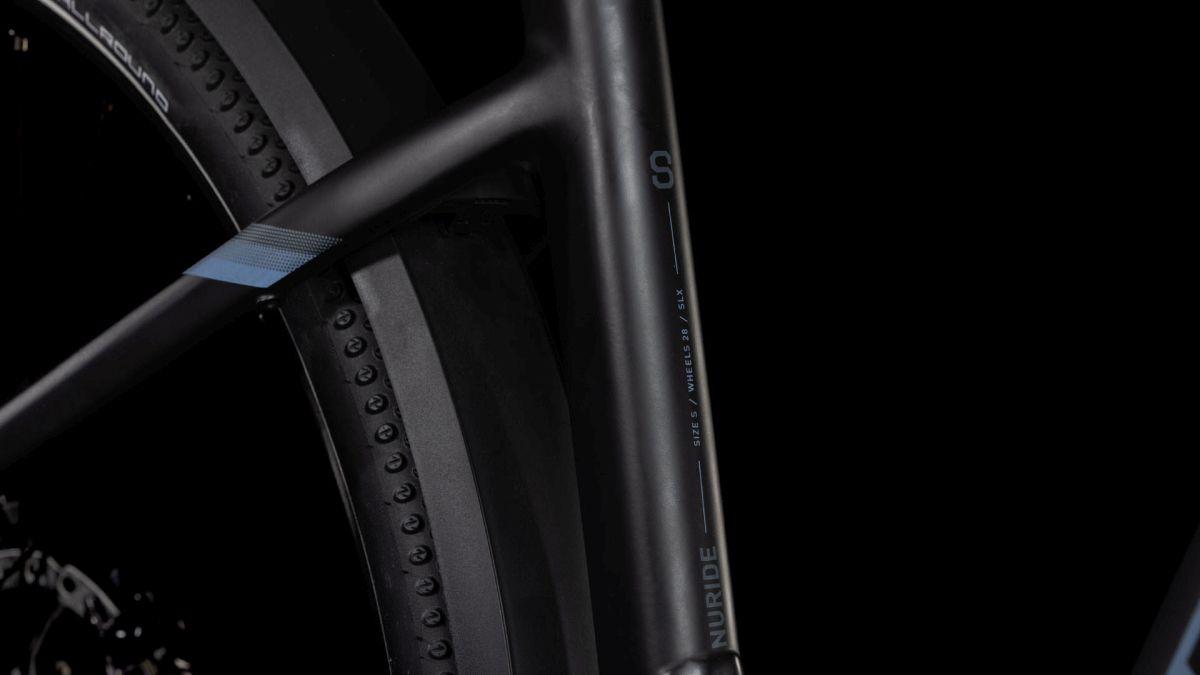 Der Tiefeinsteiger-Rahmen des Nuride Hybrid hält, was sein Name verspricht – einfaches, unkompliziertes Auf- und Absteigen sind damit garantiert. Doch da ist noch mehr: Neben einer Federgabel mit 100 mm Federweg für ein Plus an Fahrkomfort und Kontrolle haben wir das Chassis mit großzügiger Reifenfreiheit (sogar inklusive der mitgelieferten Schutzbleche) ausgestattet. Im Inneren verlaufende Züge unterstreichen die cleane Optik des Rahmens und verursachen kaum Wartungsaufwand. Ebenso harmonisch ins Design integriert sind der Bosch CX Antrieb und der 800 Wh starke PowerTube Akku. Außerdem gibt's einen Kettenschutz sowie ein UDH für einfachere Ersatzteilverfügbarkeit. Was noch? Serienmäßig verbaute Schutzbleche, Lichter und ein Seitenständer. Da kann das nächste Touren-Abenteuer kommen!