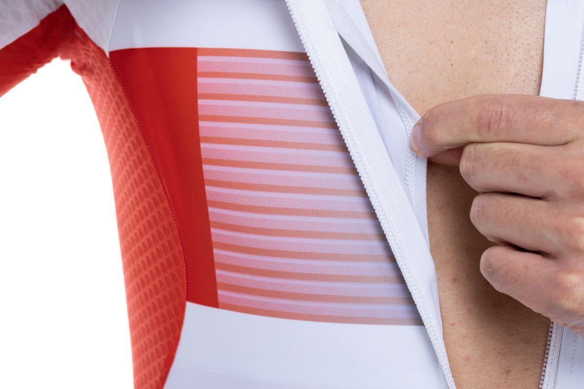 aerodynamisch optimierter Triathloneinteiler, atmungsaktiv und schnelltrocknend, 2-teilige Rückentasche, 2 versteckte Brusttaschen, extra leichtes, schnelltrocknendes CUBE Tri Pad - hergestellt in Italien, Model ist 190cm groß, Model trägt Größe L