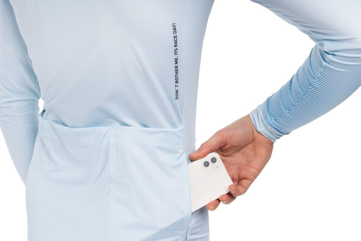 enganliegend, weicher Innensaum mit breitem Silikonband, durchgehender Frontreißverschluss, 3-teilige Rückentasche, wasserabweisende Reißverschlusstasche hinten, widerstandsfähiges und schnelltrocknendes Funktionsmaterial, UV-Schutz 50+, nahtfreier Schulterbereich, reflektierende Elemente, Model ist 185 cm groß, Model trägt Größe M