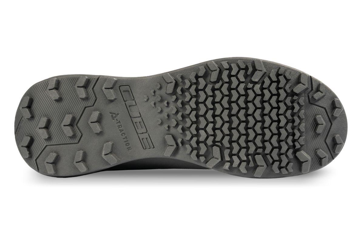 Der CUBE LOXIA PRO Schuh vereint die Griffigkeit und Flexibilität eines Outdoor-Laufschuhs mit der notwendigen Unterstützung für effizientes und komfortables Pedalieren, was die Ermüdung reduziert. Er ist ideal für viele Arten des Radfahrens, einschließlich Touren, Gravel, Enduro-Mountainbiking und alle Arten von E-Biking geeignet. Eine interne Nylon-Verstärkung sorgt für die nötige Steifigkeit beim Pedalieren, während eine stoßdämpfende EVA-Mittelsohle und die neu entwickelte, griffige A-TRACTION Gummimischung exzellente Traktion für Flatpedals sowie guten Komfort und Flexibilität für Laufpassagen abseits des Fahrrads bieten. Eine verstärkte Zehenbox schützt den Fuß, und eine NF Ergonomics-Innensohle bietet optimale Polsterung und Druckverteilung. Der Disc-Verschluss ermöglicht zudem ein schnelles und einfaches An- und Ausziehen.